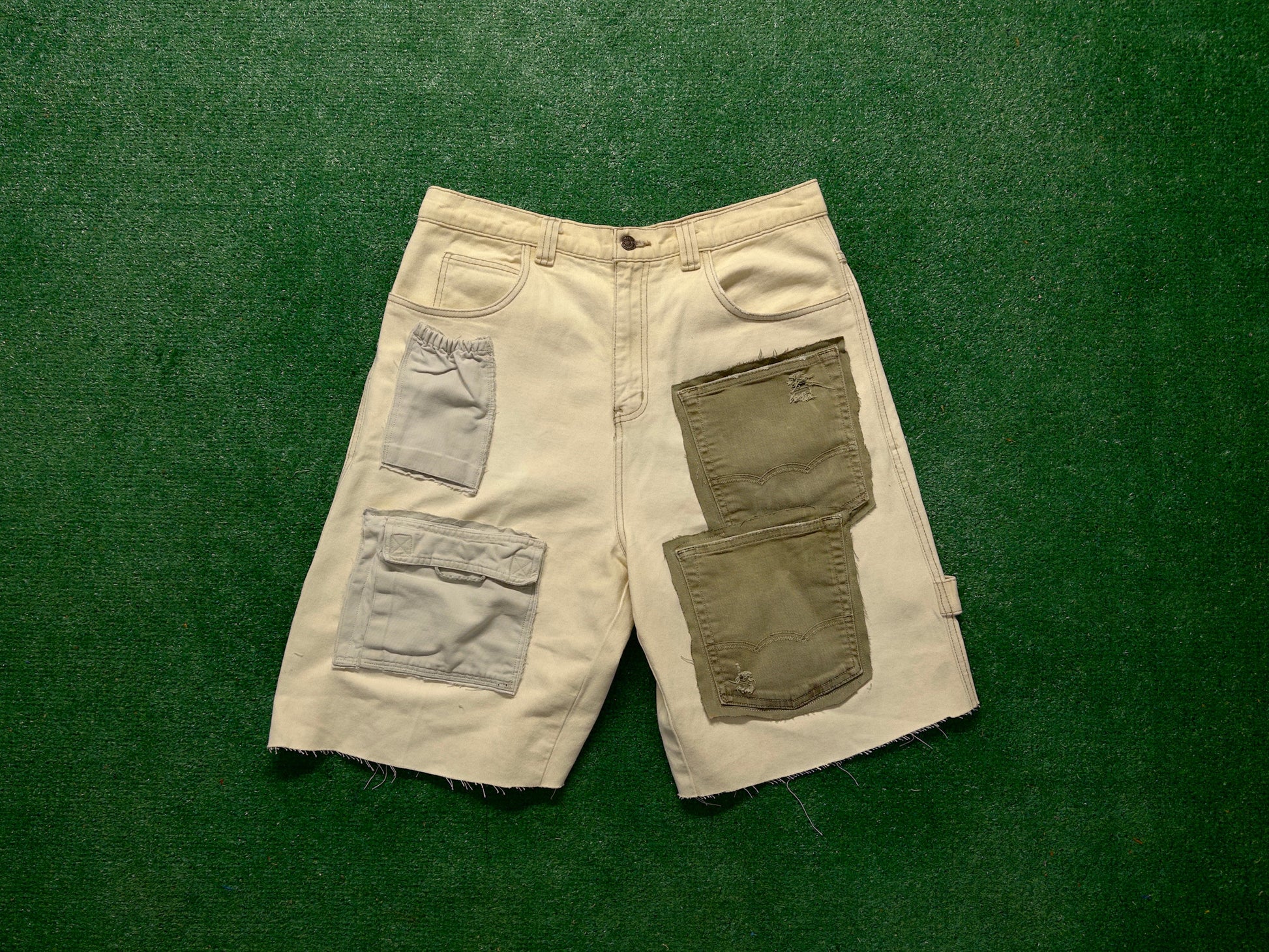Upcycled Materials: Old secondhand white carpenter jeans, scrap pockets from fishing shorts, and cutoff green denim shorts pockets